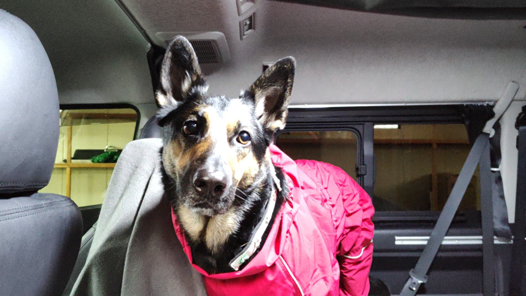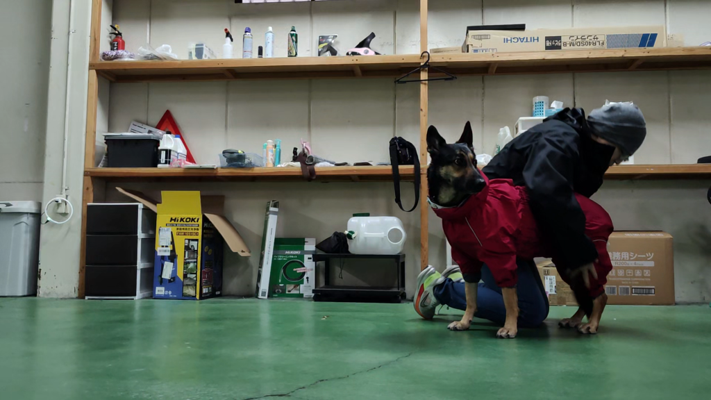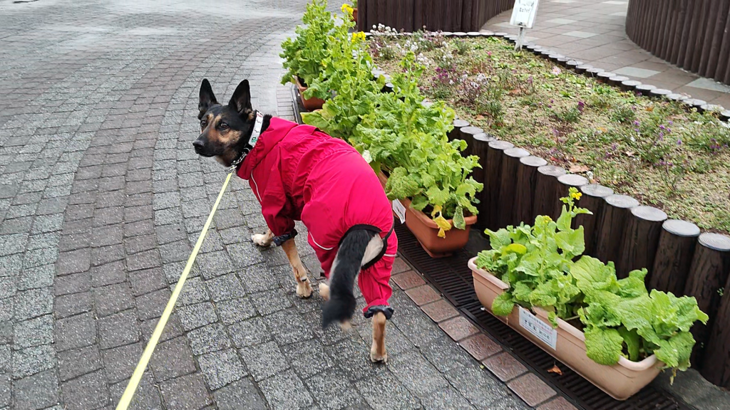 雨が降ってきそうな空模様なので、レインコートを着せてもらいましょう。