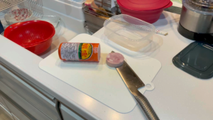 台所で、最近ハマっている明宝ハムを切っていると・・・