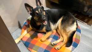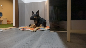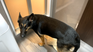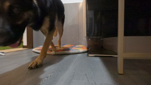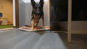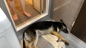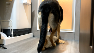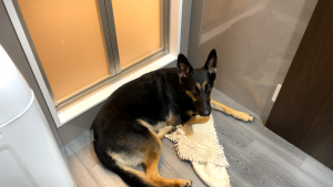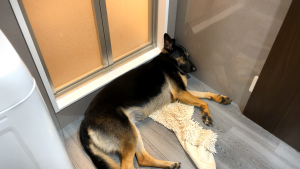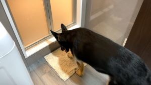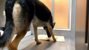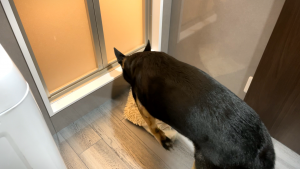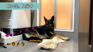 飼い主の入浴中、毎晩お風呂マットを蹴飛ばして、仕込んだカメラの方を見る犬