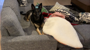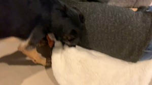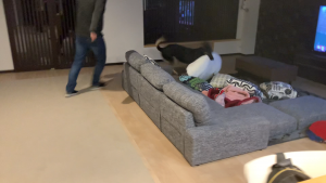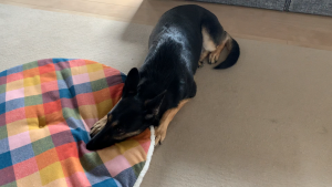 走り寄ってきた維桜さん、飼い主♂からマットを取り返そうと頑張ります。